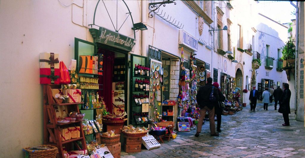 Ein Absatz über Keramik aus Grottaglie, handgemachte Textilien, Märkte mit Olivenöl und Käse.