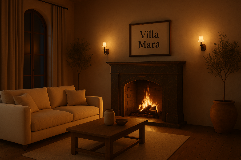 Im Winter knistert das Feuer im Kamin aus dunklem Marmor, das Licht spielt über warme Erdtöne und Holz.